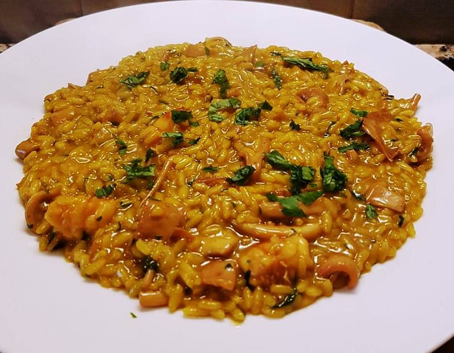 Riso carnaroli 320 gr. Calamaretti 400 gr. Gamberi 300 gr. Zafferano 1 bustina Brodo vegetale 1 Litro Olio e.v.o – sale - pepe nero q.b. 1 spicchio di aglio 1 cipolla 1 ciuffo di prezzemolo